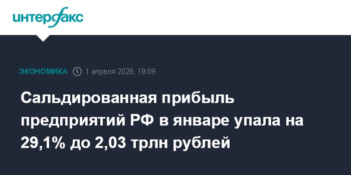 Москва. 1 апреля. INTERFAX.RU - Предприятия РФ в январе 2026 года получили сальдированную прибыль (прибыль минус убыток) в размере 2 трлн 029,1 млрд рублей, что на 29,1% меньше по сравнению с аналогичным показателем 2025 года, сообщил в среду Росстат.