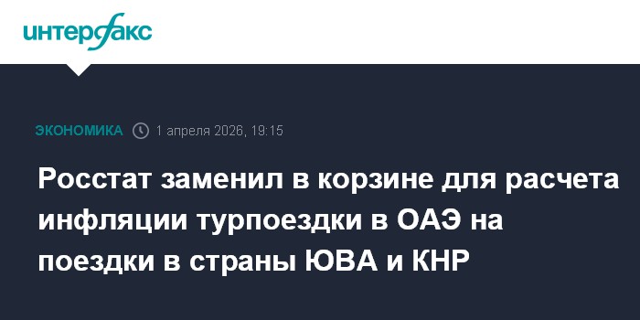 Москва. 1 апреля. INTERFAX.RU - Росстат актуализировал набор товаров и услуг для расчета индекса потребительских цен, заменив поездки в Объединенные Арабские Эмираты на поездки в страны Юго-Восточной Азии (ЮВА) и Китай, говорится в сообщении статслужбы.