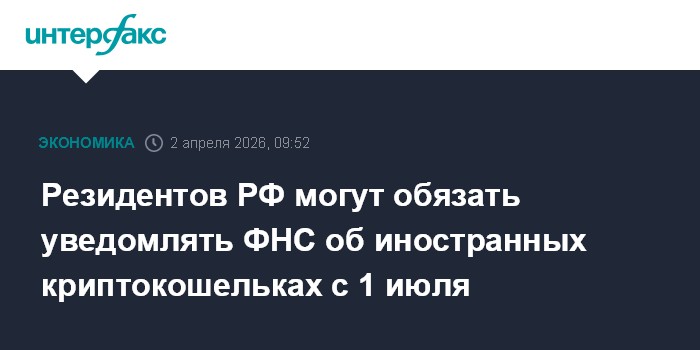 Москва. 2 апреля. INTERFAX.RU - Валютные резиденты РФ (как физлица, так и компании) с 1 июля 2026 г. будут обязаны уведомлять налоговые органы об открытии или закрытии блокчейн-кошельков в иностранных системах, не администрируемых российскими депозитариями, следует из правительственного законопроекта, внесенного в Госдуму.