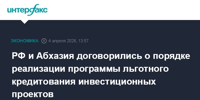 Москва. 4 апреля. INTERFAX.RU - Сопредседатели межправительственной комиссии (МПК) по социально-экономическому сотрудничеству между Абхазией и Российской Федерацией утвердили в субботу в Сухуме "Порядок реализации программы льготного кредитования инвестиционных проектов на территории Республики Абхазия".