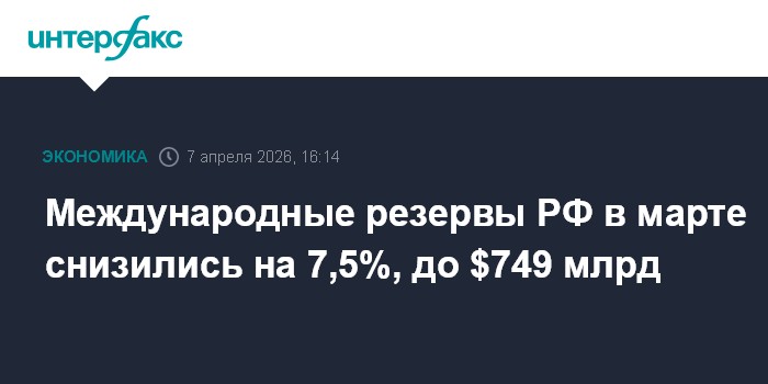 Москва. 7 апреля. INTERFAX.RU - Объем международных (золотовалютных) резервов РФ в марте 2026 года уменьшился на $60,324 млрд, или на 7,5%, до $748,984 млрд с $809,308 млрд, следует из информации на сайте ЦБ РФ.