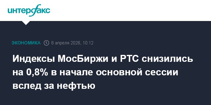 Москва. 8 апреля. INTERFAX.RU - Российский рынок акций на старте торгов основной сессии на Мосбирже в среду снижается по индексам на нефтегазовых бумагах вслед за упавшей нефтью (фьючерс на Brent откатился к $94 за баррель) на новостях о временном перемирии США и Ирана, фактором поддержки выступают выросшие металлы и внешние фондовые площадки. Индексы МосБиржи и РТС за минуту торгов снизились на 0,8% при смешанной динамике blue chips.