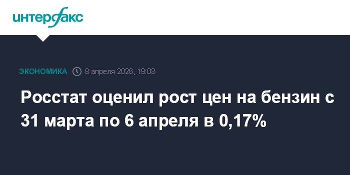 Москва. 8 апреля. INTERFAX.RU - Потребительские цены на бензин в РФ с 31 марта по 6 апреля выросли относительно предыдущей недели на 0,17% после увеличения на 0,27% с 24 по 30 марта 2026 года и на 0,36% с 17 по 23 марта, сообщил в среду Росстат.