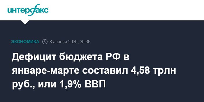 Москва. 8 апреля. INTERFAX.RU - Федеральный бюджет РФ в первом квартале 2026 года, по предварительным данным, был исполнен с дефицитом в размере 4,576 трлн рублей, или 1,9% ВВП, свидетельствует краткая ежемесячная информация Минфина.