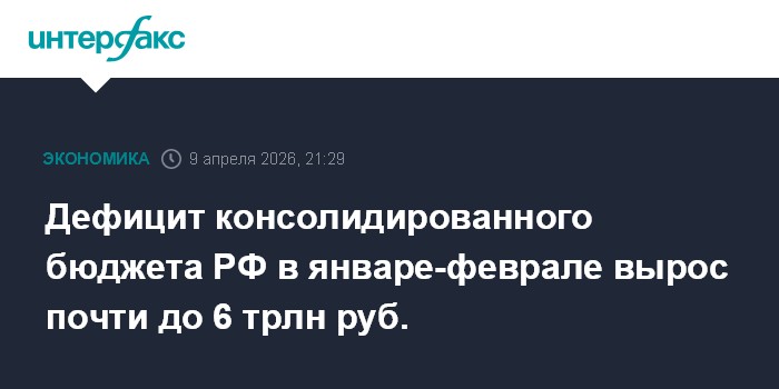 Москва. 9 апреля. INTERFAX.RU - Консолидированный бюджет РФ в январе-феврале 2026 года, по предварительной оценке, исполнен с дефицитом 5 трлн 989,5 млрд рублей, сообщается в материалах на сайте Федерального казначейства.