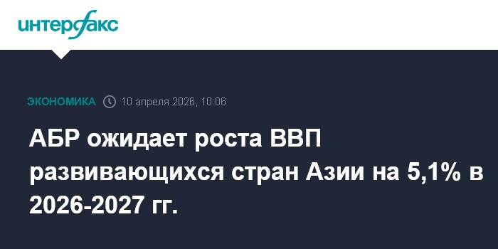 Москва. 10 апреля. INTERFAX.RU - Азиатский банк развития (АБР) прогнозирует рост ВВП развивающихся стран Азии на 5,1% в 2026-2027 гг.