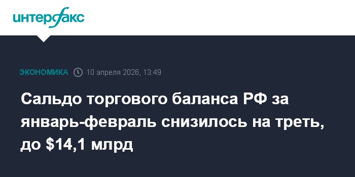 Москва. 10 апреля. INTERFAX.RU - Положительное внешнеторговое сальдо РФ в январе-феврале 2026 года снизилось по сравнению с январем-февралем 2025 года на 32,9% и составило $14,1 млрд (против $21,0 млрд годом ранее).