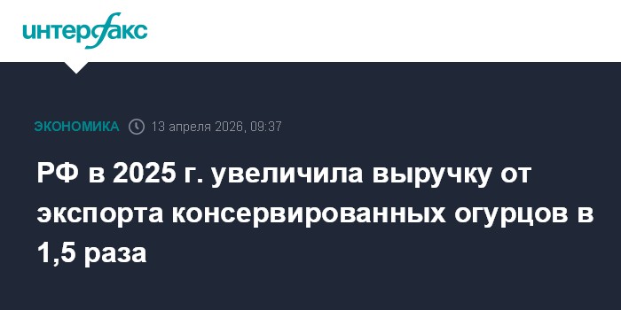 Москва. 13 апреля. INTERFAX.RU - РФ в 2025 году экспортировала консервированных огурцов на $16 млн, что в 1,5 раза больше, чем в 2024 году. В натуральном выражении поставки выросли на 22%, до более 11,6 тыс. тонн, сообщает федеральный центр "Агроэкспорт" со ссылкой на оценки экспертов.