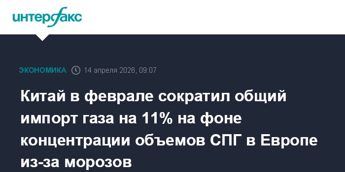 Москва. 14 апреля. INTERFAX.RU - Китай в феврале 2026 года импортировал суммарно (по трубопроводам и в виде СПГ) 10,641 млрд куб. м природного газа, что на 11% меньше, чем годом ранее (11,9 млрд куб. м), сообщает Главное таможенное управление КНР.