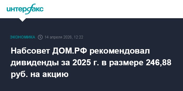 Москва. 14 апреля. INTERFAX.RU - Наблюдательный совет "ДОМ.РФ" рекомендовал выплатить по итогам 2025 года дивиденды в размере 246,88 рубля на акцию, сообщила компания.