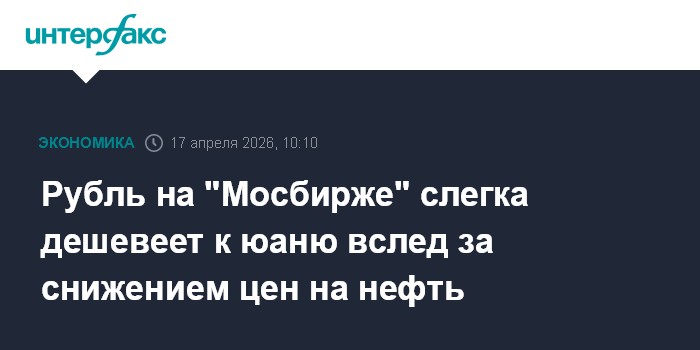 Москва. 17 апреля. INTERFAX.RU - На открытии торгов пятницы на "Московской бирже" рубль дешевеет к юаню на фоне снижения котировок нефти.