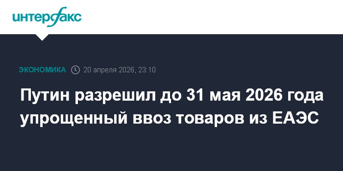 Москва. 20 апреля. INTERFAX.RU - Российские компании и индивидуальные предприниматели смогут до 31 мая 2026 года импортировать товары из стран Евразийского экономического союза (ЕАЭС) по упрощенной процедуре - с возможностью подтверждения происхождения товара и проведения его маркировки уже после ввоза в РФ.