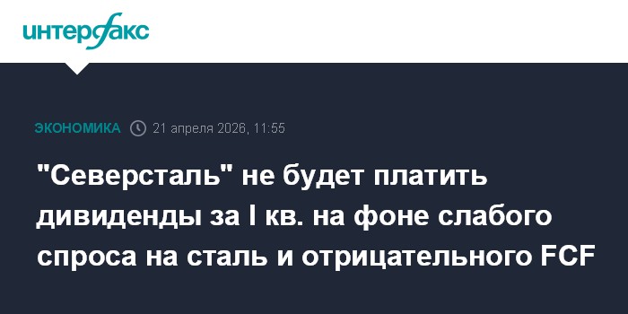 Москва. 21 апреля. INTERFAX.RU - "Северсталь" не будет выплачивать дивиденды за первый квартал 2026 года, говорится в сообщении компании.