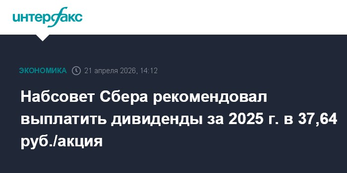 Москва. 21 апреля. INTERFAX.RU - Наблюдательный совет Сбербанка рекомендовал акционерам на годовом собрании принять решение о выплате дивидендов за 2025 год в размере 37,64 руб. на одну обыкновенную и привилегированную акцию, говорится в сообщении банка.