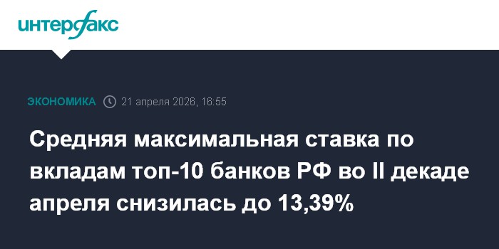 Москва. 21 апреля. INTERFAX.RU - Среднее арифметическое значение максимальных процентных ставок, определенное для банков топ-10 по рублевым вкладам без учета вкладов с дополнительными условиями, во второй декаде апреля 2026 года снизилось до 13,39% с 13,43% в первой декаде, сообщается на сайте ЦБ РФ.