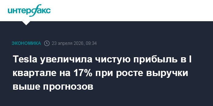 Москва. 23 апреля. INTERFAX.RU - Американский производитель электромобилей Tesla Inc. увеличил чистую прибыль в первом квартале 2026 года на 17%, выручку - на 16%. Скорректированная прибыль и выручка превзошли прогнозы рынка.