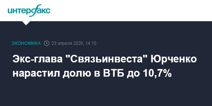 Москва. 23 апреля. INTERFAX.RU - Экс-глава "Связьинвеста" Евгений Юрченко увеличил долю в ВТБ до 10,68% с 7,6%, говорится в материалах банка.