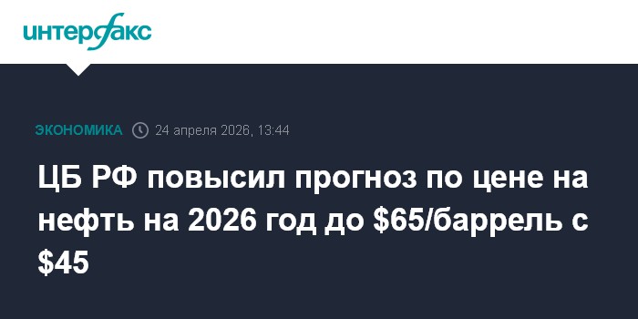 Москва. 24 апреля. INTERFAX.RU - ЦБ РФ повысил прогноз по цене на нефть, рассчитываемой для целей налогообложения, на 2026 год до $65 за баррель с $45 в февральском прогнозе.