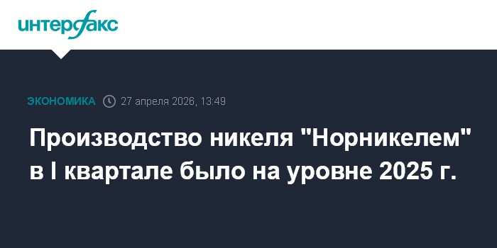 Москва. 27 апреля. INTERFAX.RU - "Норильский никель" в первом квартале 2026 г. выпустил 41,75 тыс. тонн никеля, что на 0,3% выше уровня годичной давности, сообщила компания в понедельник.