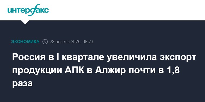 Москва. 28 апреля. INTERFAX.RU - Россия в первом квартале 2026 года экспортировала в Алжир 187,5 тысяч. тонн продукции АПК, что в 1,8 раза больше, чем годом ранее. Стоимость поставок выросла почти в полтора раза, до $127 млн, сообщил федеральный центр "Агроэкспорт" со ссылкой на оценки экспертов.