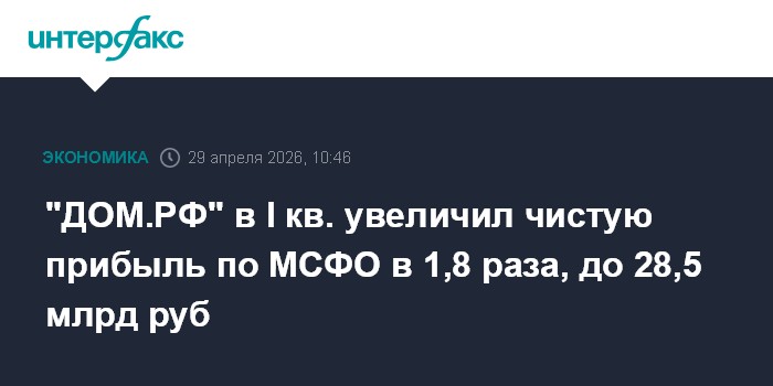 Москва. 29 апреля. INTERFAX.RU - "ДОМ.РФ" в первом квартале 2026 года увеличил чистую прибыль по МСФО в 1,8 раза в годовом выражении, до 28,5 млрд рублей, свидетельствует отчетность компании.