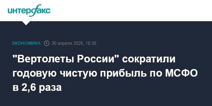 Москва. 30 апреля. INTERFAX.RU - АО "Вертолеты России" в 2025 году снизило чистую прибыль по МСФО в 2,6 раза, до 5 млрд рублей, говорится в отчетности компании.