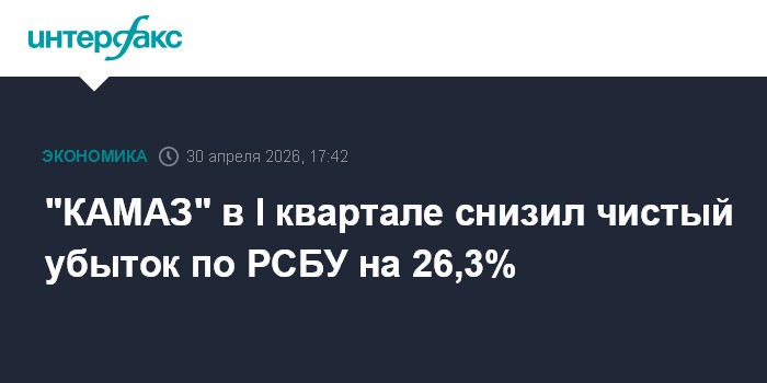 Москва. 30 апреля. INTERFAX.RU - Чистый убыток ПАО "КАМАЗ" по РСБУ в I квартале 2026 года снизился год к году на 26,3%, до 9,2 млрд рублей, сообщила компания.