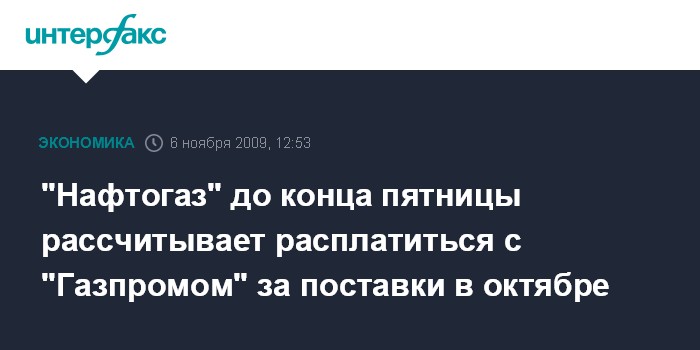 Москва. 6 ноября. INTERFAX.RU – Национальная акционерная компания "Нафтогаз Украины" планирует своевременно и в полном объеме рассчитается за октябрьские поставки природного газа с ОАО "Газпром", до конца дня пятницы осуществив соответствующий платеж, сообщил пресс-секретарь НАК Валентин Землянский.
