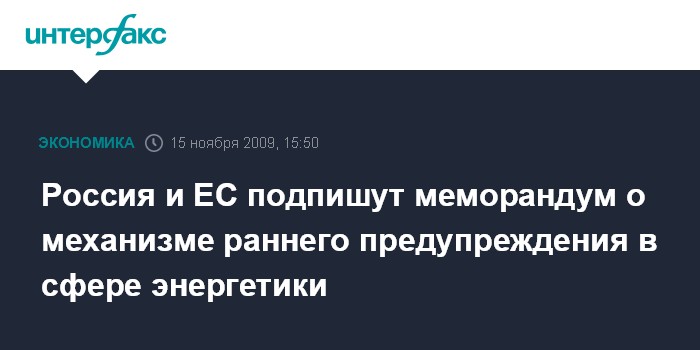 Москва. 15 ноября. INTERFAX.RU - Россия и Евросоюз планируют 16 ноября подписать в Москве меморандум о механизме раннего предупреждения в сфере энергетики, говорится в сообщении Минэнерго. С российской стороны документ подпишет глава Минэнерго Сергей Шматко, со стороны ЕС - комиссар Еврокомиссии по энергетики Анрис Пиебалгс. Документ призван обеспечить устойчивое и беспрепятственное энергоснабжение, предупреждение и преодоление с минимальными негативными последствиями чрезвычайных ситуаций в сфере энергетики. Меморандум, в частности, будет определять порядок осуществления совместных мер по предупреждению и оперативному реагированию в случае возникновения или угрозы возникновения чрезвычайной ситуации.