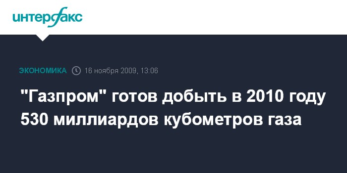 Москва. 16 ноября. INTERFAX.RU - "Газпром" готов добыть в 2010 г. 530 млрд куб. м газа, сообщается в квартальном отчете монополии. "В связи с падением спроса на газ на внутреннем и зарубежных газовых рынках, вызванным снижением темпов промышленного производства в результате мирового финансово-экономического кризиса "Газпром" планирует обеспечить в 2010 году добычу газа в объеме около 530 млрд куб. м", - сообщается в документе.