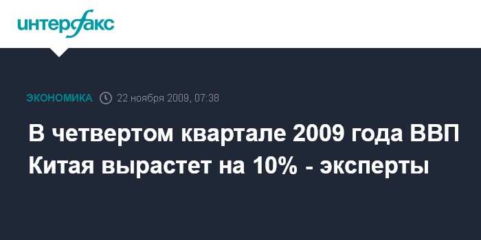 Пекин. 22 ноября. ИНТЕРФАКС - В четвертом квартале 2009 года рост китайской экономики должен составить 10%, считают эксперты исследовательского Центра развития Госсовета КНР.