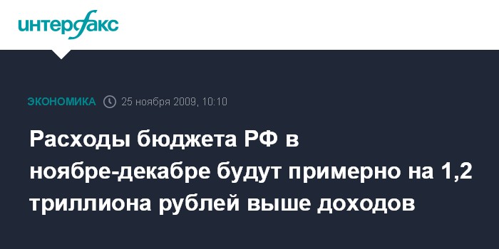 Москва. 25 ноября. INTERFAX.RU - Расходы бюджета РФ в последние два месяца 2009 г. будут примерно на 1,2 трлн рублей выше доходов, заявил вице-премьер, министр финансов РФ Алексей Кудрин, выступая на финансовом форуме в среду.