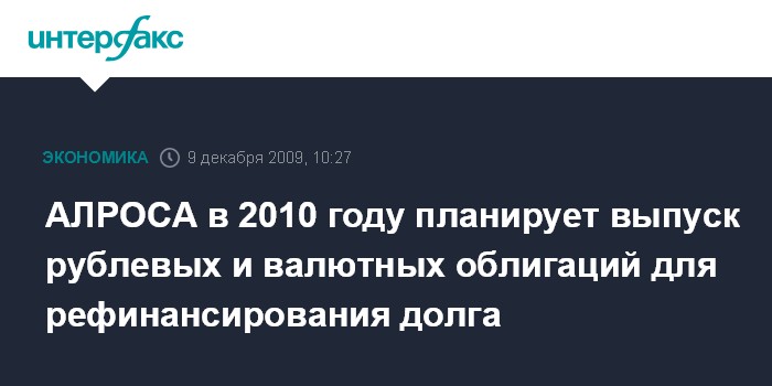 Москва. 9 декабря. INTERFAX.RU - АК "АЛРОСА" в 2010 г. планирует выпуск рублевых и валютных облигаций для рефинансирования долга, говорится в сообщении компании.