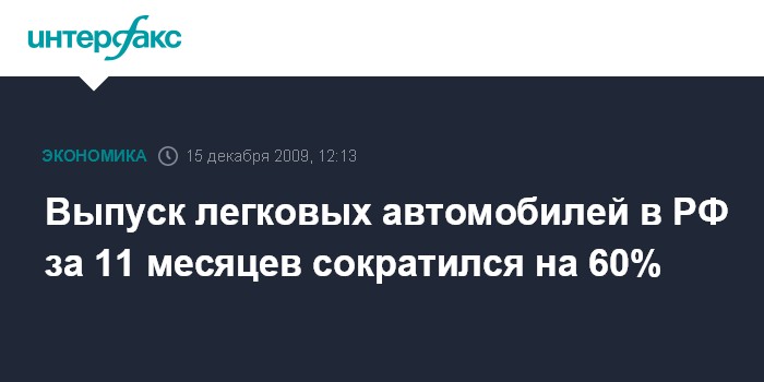 Москва. 15 декабря. INTERFAX.RU – Выпуск легковых автомобилей в РФ в январе-ноябре 2009 года сократился, по сравнению с аналогичным периодом прошлого года, на 60,4%, до 544 тыс. шт., сообщила Федеральная служба государственной статистики РФ (Росстат).