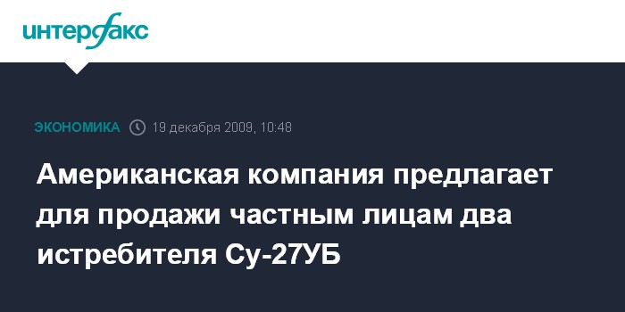 Москва. 19 декабря. INTERFAX.RU - Два двухместных истребителя Су-27УБ выставила на продажу частная американская компания Pride Aircraft, находящаяся в штате Иллинойс.