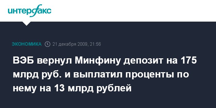 В Минфине подтвердили эту информацию. "Да я подтверждаю, вернули весь депозит и проценты по ставке 7% годовых", - сказал агентству "Интерфакс-АФИ" заместитель директора долгового департамента Минфина РФ Петр Казакевич. По его словам, сумма процентов составила порядка 13 млрд рублей.