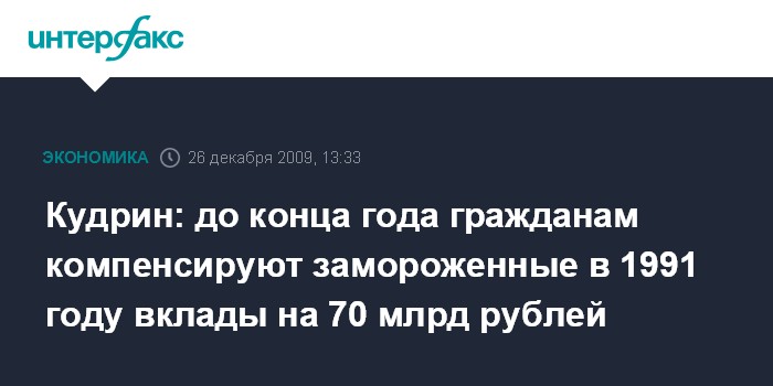"В 2009 году будет компенсировано вкладчикам средств вкладов на сумму 70 млрд рублей. Всем категориям вкладчиков мы завершаем в этом году первую компенсацию, включая все остатки еще некомпенсированных вкладов из расчета один к одному от суммы замороженного вклада", - сообщил министр финансов.