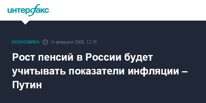 Москва. 14 февраля. INTERFAX.RU - Президент РФ Владимир Путин заявляет, что государство и впредь будет следить за изменениями инфляции и корректировать в соответствии с этим пенсионные доходы граждан.