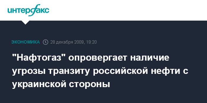 Москва. 28 декабря. INTERFAX.RU - "Нафтогаз Украины" официально заявляет, что с украинской стороны не существует никакой угрозы для транзита российской нефти европейским потребителям. Монопольный оператор нефтетранспортной системы Украины ОАО "Укртранснафта", 100% акций которой находятся в управлении НАК "Нафтогаз Украины", и российская компания "Транснефть" проводят переговорный процесс о подписании ежегодного дополнительного соглашения к действующему контракту от 2004 г., сообщает пресс-центр "Нафтогаза" в понедельник. "На сегодня специалисты двух компаний согласовывают объемы транзита российской нефти и другие краткосрочные условия, договоренности по которым завершаются 31 декабря 2009 года", - говорится в пресс-релизе.
