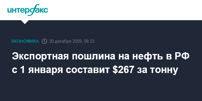 Москва. 30 декабря. ИНТЕРФАКС-АФИ - Экспортная пошлина на нефть в РФ с 1 января 2010 г. составит $267 за тонну. Соответствующее постановление, подписанное премьер-министром Владимиром Путиным 25 декабря, размещено на сайте правительства.