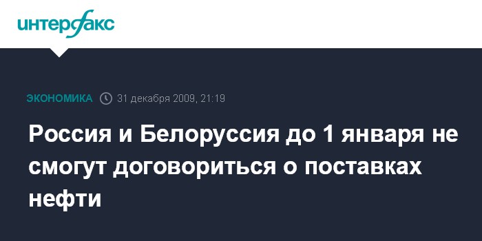 Москва. 31 декабря. INTERFAX.RU - России и Белоруссии не удалось достичь соглашения о поставках российской нефти в Белоруссию.