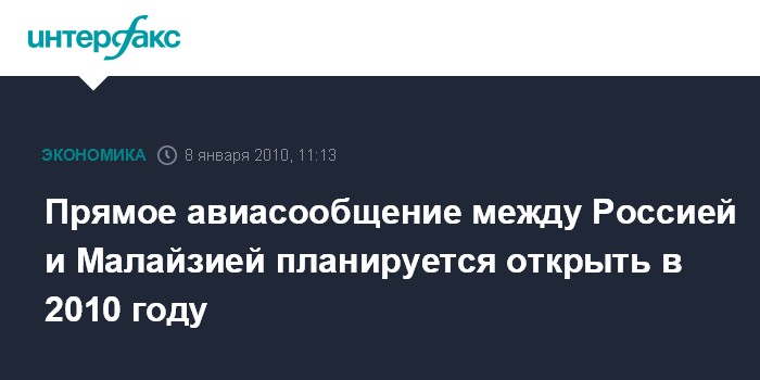 Москва. 9 января. INTERFAX.RU - Между Россией и Малайзией в 2010 г. планируется открыть прямое регулярное авиасообщение, которое позволит заметно увеличить число российских туристов в стране, сообщил "Интерфаксу" директор представительства Министерства по туризму Малайзии в России и странах СНГ Аммар Абд Гапар.