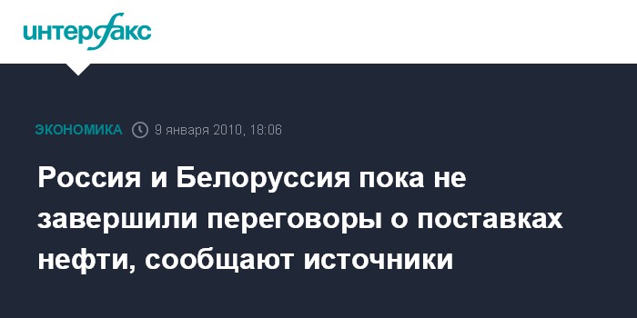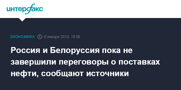 Москва. 9 января. INTERFAX.RU - Россия и Белоруссия в субботу продолжают переговоры о поставках нефти, сообщил "Интерфаксу" источник, близкий к переговорному процессу с российской стороны. "Переговоры продолжаются, и пока на данный момент еще не завершены", - сказал он. Источник, близкий к переговорам с белорусской стороны, подтвердил агентству "Интерфакс-Запад", что переговоры, которые продолжились в субботу, на данный момент не завершены. Накануне сообщалось, что делегация Белоруссии во главе с первым вице-премьером Владимиром Семашко направилась в Москву на очередной раунд переговоров по условиям поставки нефти по приглашению вице-премьера РФ Игоря Сечина.