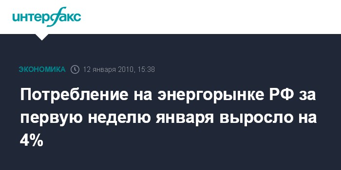 Москва. 12 января. INTERFAX.RU - Потребление на энергорынке РФ за период с 1 по 7 января выросло на 3,9% по сравнению с аналогичным периодом 2009 г., сообщило НП "Совет рынка". По сравнению с предыдущей неделей оно сократилось на 5,7%. В то же время в последнюю неделю 2009 года (с 25 по 31 декабря) электропотребление по сравнению с аналогичным периодом 2008 г. выросло на 4,6%, а по сравнению с предыдущей неделей снизилось на 4%.