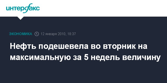 Нью-Йорк. 12 января. INTERFAX.RU - Нефть подешевела во вторник на максимальную за пять недель величину на ожиданиях потепления в восточной части США и сокращения, в связи с этим, спроса на топливо в этой стране, сообщило агентство Bloomberg.