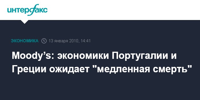 Москва. 13 января. INTERFAX.RU - Экономики Португалии и Греции, "вероятно, ожидает медленная смерть", поскольку правительства обеих стран вынуждены выделять значительные ресурсы для обслуживания госдолга, говорится в сообщении рейтингового агентства Moody‘s Investors Services. "У правительств еще есть время для осуществления мер, которые помогут избежать этой ситуации, но это время не может тянуться бесконечно", - отмечают аналитики Moody‘s.