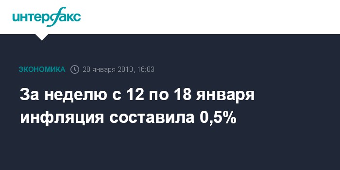 Москва. 20 января. IFX-NEWS - За период с 12 по 18 января 2010 года инфляция составила 0,5%, с начала месяца - 1,2%. Об этом говорится в сообщении Федеральной службы госстатистики (Росстата). Для сравнения: в 2009 г. потребительские цены с начала месяца выросли на 1,2%, в целом за январь - на 2,4%