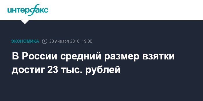 Москва. 28 января. INTERFAX.RU - Средний размер взятки в РФ в прошлом году вырос в 2,5 раза и составил 23 тыс. рублей, сообщили "Интерфаксу" в департаменте экономической безопасности (ДЭБ) МВД РФ в четверг.