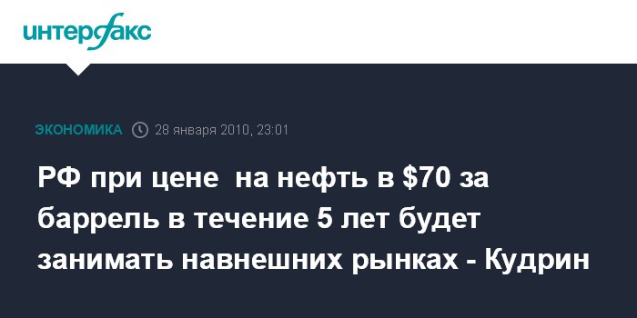 РФ при цене на нефть в $70 за баррель в течение 5 лет будет занимать навнешних рынках - Кудрин