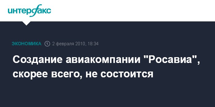 Москва. 2 февраля. INTERFAX.RU - Авиакомпания "Росавиа", которую госкорпорация "Ростехнологии" намеревалась создать на основе своих авиационных активов, скорее всего, так и не появится, сообщили "Интерфаксу" несколько источников в авиационных кругах.